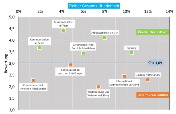 Welche Themen als Treiber gesehen werden können, hängt von der interessierenden Zielgröße ab. Außerdem sind es natürlich bei jeder Mitarbeitendenbefragung andere Themen, die unterdurchschnittlich bewertet werden.